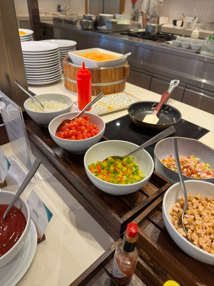 서양식 메뉴로는 에그 스테이션에서 주문 즉시 만들어주는 오믈렛과 스크램블이 있었고, 바삭한 베이컨, 소시지, 해시브라운도 준비되어 있었습니다. 특히 샐러드 코너가 정말 신선했어요